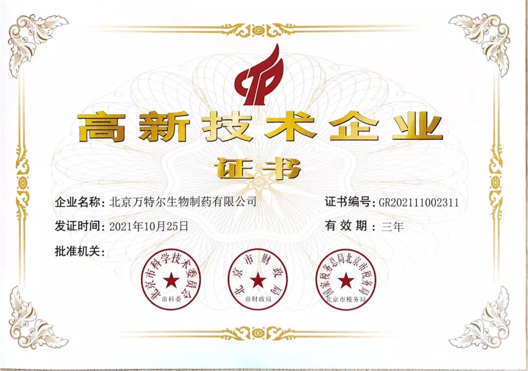 近日,北京万特尔生物制药有限公司传来佳音,经北京市高新技术企业认定管理工作小组办公室组织专家评审,万特尔公司通过高新技术企业的认定,再次入选高新技术企业。