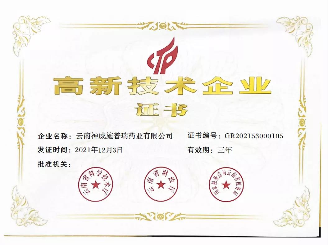 近日,云南省科技厅发布了关于云南省2021年度认定高新技术企业名单的公告,云南太阳集团施普瑞药业有限公司位列其中。