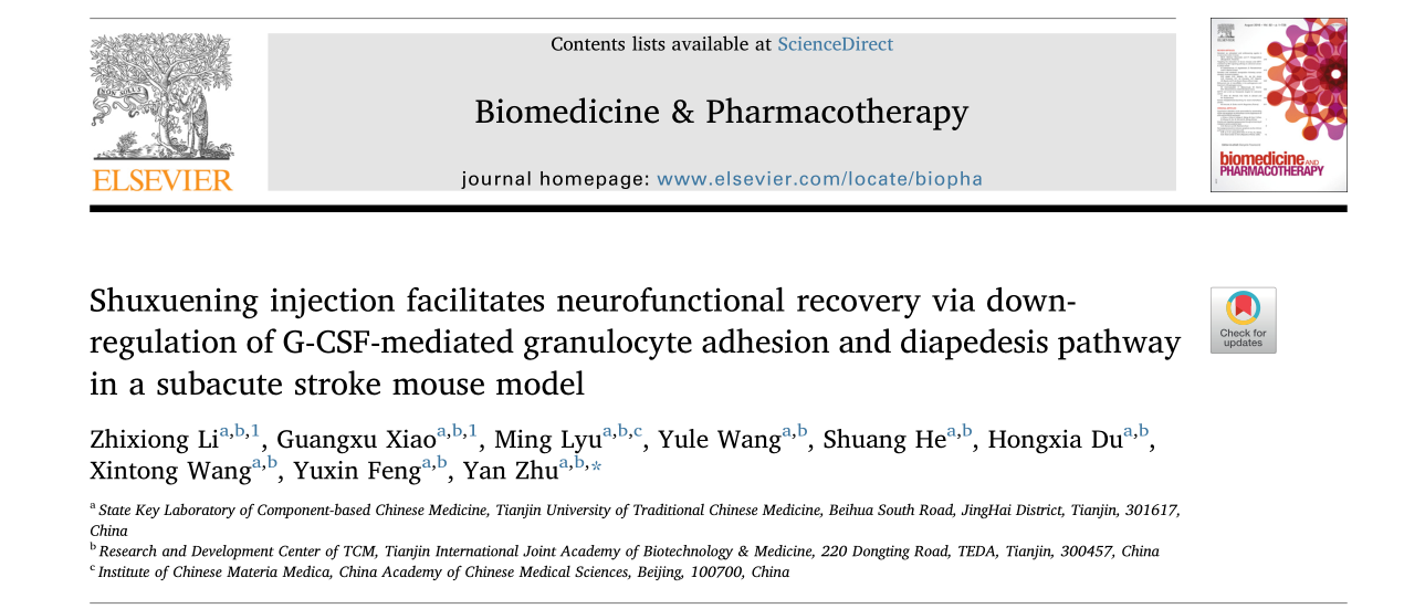 近日,由中国工程院院士、天津中医药大学校长张伯礼团队,联合太阳成集团tyc234cc主导研究的“舒血宁注射液在缺血性心-脑血管疾病临床定位的基础研究和冠心宁注射液药效学研究”课题取得新进展。该研究指出,舒血宁注射液可通过下调粒细胞集落刺激因子(G-CSF)介导的抑制粒细胞粘附和血细胞渗出而促进亚急性卒中小鼠模型的神经功能的恢复。该成果发表于国际知名SCI刊物《Biomedicine & Pharmacotherapy》上,该期刊的影响因子为3.7分。